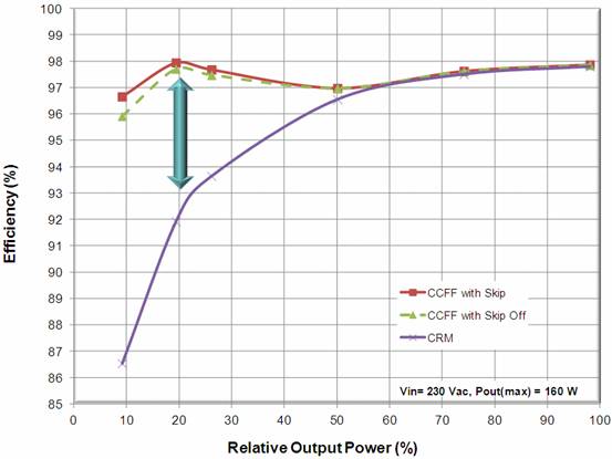 采用CCFF控制架構,最大的好處莫過于提升能效。采用傳統CrM(臨界導電模式)/BCM(邊界線導電模式),在負載降低時,開關頻率上升;負載極低時,控制器可能進入“跳周期模式”,滋生可聽噪聲。而采用CCFF控制架構,可以在負載降低時降低開關頻率,減小功率損耗;在輕載時,控制器可以鉗位高于可聽噪聲頻段的較低頻率;負載極低時,則采用跳周期模式工作(可以輕易關閉)。因此,這種谷底導通可進一步提升能效,減小電磁干擾。圖4比較了基于NCP1611CCFF PFC及傳統CrM PFC在不同負載條件下的能效。由圖中可見,在10%輕載條件下,基于帶跳周期模式的NCP1611的演示板的能效高達近97%(關閉跳周期模式下也達近96%),而基于傳統CrM架構的演示板能效僅為近87%,相關近10%。可見NCP1611在提升電源輕載能效方面表現尤為優異。