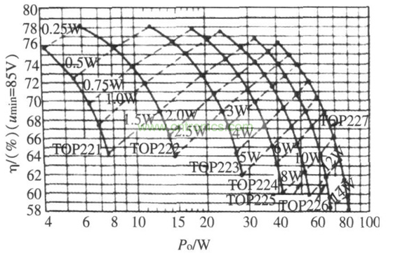 寬范圍輸入的交流電壓為85~ 265 V, 在這種條件下,TOP221~ TOP227 系列單片開關電源的P D,η,Po 關系曲線如下,見圖3、圖4。