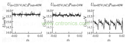 圖7分別給出了輸入電壓220 V ( 交流),輸出功率為40 W; 輸入電壓85 V ( 交流),輸出功率為24 W和輸入電壓85 V( 交流),輸出功率為40 W 時的輸出電壓波形。