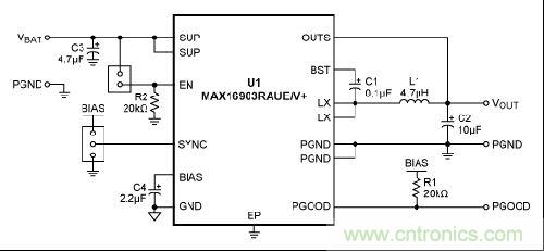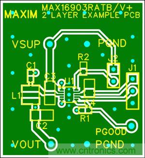 針對開關穩壓器MAX16903(圖9)外圍元件的合理布局,有助于從源頭降低噪聲和電磁輻射,有助于節約項目評估階段的寶貴時間,簡化設計。
