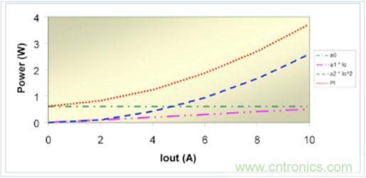如果意識到電源損耗與輸出電流相關(guān)(可用輸出電流替換 X),那么系數(shù)項(xiàng)就能很好地與不同來源的電源功率損耗聯(lián)系起來。例如,ao 代表諸如柵極驅(qū)動、偏壓電源和磁芯的固定開銷損耗以及功率晶體管 Coss 充電與放電之類的損耗。這些損耗與輸出電流無關(guān)。第二項(xiàng)相關(guān)聯(lián)的損耗 a1 直接與輸出電流相關(guān),其典型表現(xiàn)為輸出二極管損耗和開關(guān)損耗。在輸出二極管中,大多數(shù)損耗是由于結(jié)電壓引起的,因此損耗會隨著輸出電流成比例地增加。