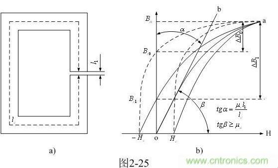 在圖2-25-a中,假設L1為氣隙長度,變壓器鐵芯磁路的總長度為Lc,則磁路的磁通勢為: