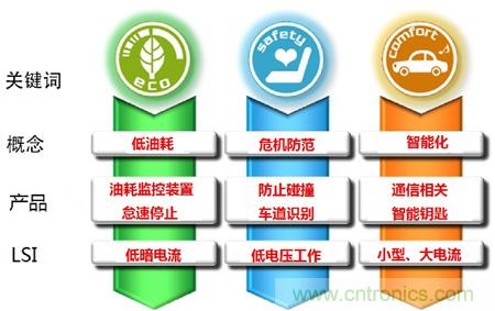第二個(gè)關(guān)鍵詞是 "信息與舒適" (comfort)。除作為出行工具之外,汽車更多被視為日用品,其智能化也在不斷發(fā)展,例如可以下載并欣賞喜歡的音樂(lè),在路上即可輕松獲得目的地的信息等。而為了實(shí)現(xiàn)這些功能,需要眾多通信相關(guān)的電子元器件。另外,與提高舒適性相關(guān)的電子化也在不斷發(fā)展,無(wú)需鑰匙即可開關(guān)車門和啟動(dòng)引擎的智能鑰匙在普通車輛中已基本普及等,使車內(nèi)越來(lái)越成為更舒適的空間。