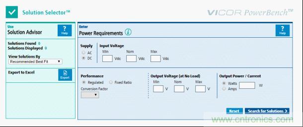 什么樣的產品能夠滿足要求呢?有很多這種信息的來源。例如,Vicor提供了一種解決方案選擇工具,可以搜索可用元件的數據庫,并推薦滿足客戶的輸入和輸出需求的解決方案。利用一個智能工具,如Vicor解決方案選擇工具(solution selector),可將產生可能元件的候選者名單所需要的時間縮短到幾乎為零,并且可以很容易地根據對應用來說最重要的標準,為特定設計選擇一個最佳的元件。大多數工程師恰恰沒有令人奢望的“學習時間”來手動完成這項重要任務。
