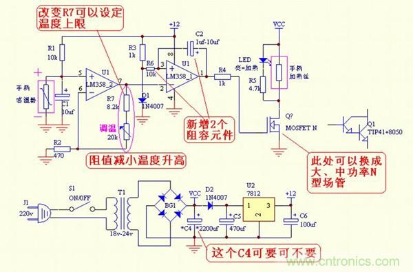 358運放,我用的是貼片式的,一共只找到兩個。另一個做焊臺了,那個是直插的,順便把焊臺的電路圖也上傳,焊臺的C4我是加的。