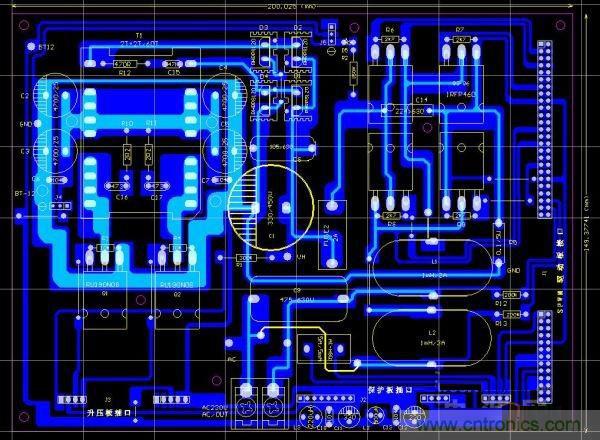 下面是功率主板的PCB截圖,長寬為200X150MM,因?yàn)?,這部分的電路比較簡單,就不給出原理圖了,直接畫了PCB圖,如圖1所示。