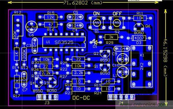 DC-DC升壓驅(qū)動板,采用的是很常見的線路,用一片SG3525實(shí)現(xiàn)PWM的輸出,后級用二組圖騰輸出,經(jīng)實(shí)驗(yàn),如果用一對190N08,圖騰部分可以省略,直接用3525驅(qū)動就夠了。板上有二個小按鈕開關(guān),S1、S2、S1是開機(jī)的,S2是關(guān)機(jī)的,可以控制逆變器的啟動和停機(jī)。