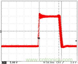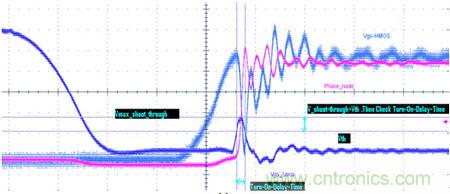 測試的目的是看上MOS管導通時,有沒有同時把下管打開,從而導致電源直接導通到地而引起短路。如圖三所示藍色曲線(Vgs_Lmos)就是下管在上管導通的同時,被帶了起來,如果藍色曲線的被帶起來的尖峰超過了MOS管的Vth要求,同時持續(xù)時間(Duration)也超過了datasheet要求,從而就會有同時導通的風險。當然,這是大家最常見到的情況。