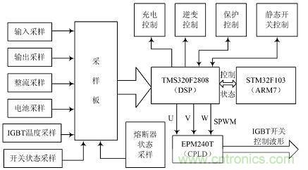 該模塊是逆變信號產生及反饋檢測調整模塊, 核心是一片C2000 系列高性能DSP 處理器TMS320F2808(以下簡稱F2808) , F2808 產生的SPWM 信號經過CPLD 進行邏輯延時移相形成三相逆變器IGBT 控制信號。F2808 是德州儀器( TI) 公司的一款高速DSP 芯片, 最高運行速度可達100 MIPS, 為適應工控強干擾環境, F2808 內部集成了增強型輸入捕獲單元( eCAP) 和帶死區控制功能的輸出比較PWM 產生單元( ePWM) ,12 位16 通道快速ADC 單元; 內核支持用于定點DSP實現浮點運算的IQ 變換函數庫; 還有諸如SCI, SPI,eCAN 等豐富而通用的外設接口。如圖2 所示, 設計中F2808 的主要任務是監控IPS 功率部分的開關狀態和動作, 根據逆變器和負載狀態反饋調整3 路SPWM波形的輸出,電池充電脈沖控制。DSP 輸出的3 路SPWM 信號直接送給CPLD,經過CPLD 的等間隔脈沖延遲移相作為逆變器產生U, V, W 三相電的控制波形。