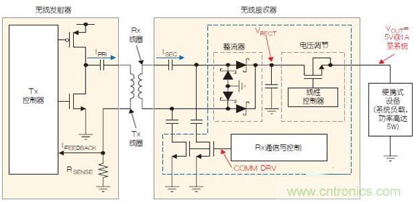 典型的無線電源系統(圖2)在便攜式設備內有一個接收器(Rx),它提供能量給電池充電。發射器(Tx)位于一個固定的底座內,并連接至壁掛式電源。輸入電能轉換為交流電,然后在發射器線圈與接收器線圈非常接近時,通過線圈發生磁耦合。接收器的輸出在電流高達1A時通常為5V,其可為便攜式設備內的電池充電器IC提供輸入功率。