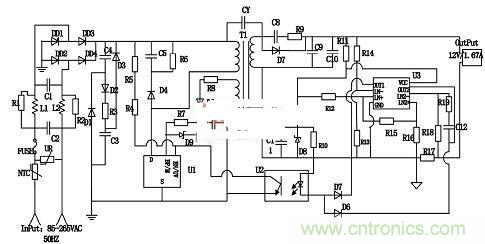 具體的工作原理是:NCS1002調節輸出的電壓值,當輸出電壓超過設定電壓值時,電流流向光耦LED,從而下拉光耦中晶體管的電流。當電流超過TNY279的使能引腳的閾值電流時,將抑制下一個周期,當下降的電壓小于反饋閾值時,會使能一個開關周期,通過調節使能周期的數量,對輸出電壓進行調節,同樣,當通過檢測到R16上的電流即輸出電流大于設定的值時,電流通過另一個二極管下拉光耦LED中晶體管的電流,達到抑制TNY279的下一個周期的目的,當輸出電流小于設定電流時會使能一個開關周期,通過這樣的反饋調節機制,能使得輸出的電壓和電流都處于穩定的狀態。
