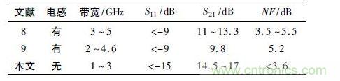 本文設計的寬帶低噪聲放大器與已經發表文獻中的寬帶低噪聲放大器的性能比較如表1 所示,這些文獻均采用0. 18 μm 工藝進行設計,具有一定的比較意義。通過表1 可以看出,本設計中各項參數都達到了較好的性能指標,避免了傳統集成電路設計中需要采用電感的缺點,而電感通常在電路設計中占用非常大的面積,本文設計的寬帶低噪聲放大器省略了傳統低噪聲放大器設計中的電感,這將在很大程度上減少芯片的面積; 更為重要的是該芯片依靠自身的MOS 管和比例電阻實現了內匹配,避免了大批量應用時由于芯片內部參數受工藝參數影響而造成的外圍匹配電路的更改,簡化了芯片的應用,在實際的工程應用中具有重要的意義。