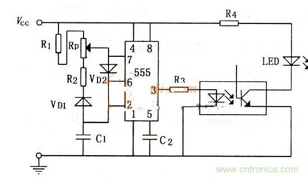 加電(Vcc=5V或6V)后若發光二極管LED按2Hz左右的頻率閃動,則說明該被測管質量性能良好,其原因是,加電后,定時器會從3引腳輸出脈沖電壓(此電壓與Vcc的值有關,此脈沖電壓通過電阻器R3加到光電耦合器發光管上,其振蕩頻率:f=2Hz因此,也就出現了上述現象。此電路能調節LED的發光時間間隔。