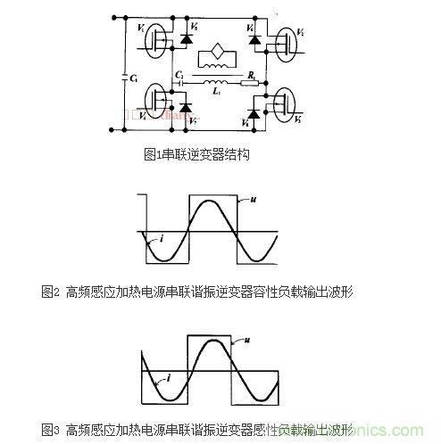 作為高頻感應(yīng)加熱電源設(shè)備的重要組成部分,串聯(lián)諧振逆變器在工作中具有損耗低、工作適應(yīng)性良好等優(yōu)勢。這種逆變器在實際應(yīng)用中也被稱為電壓型逆變器,其基礎(chǔ)結(jié)構(gòu)的原理圖如圖1所示。在實際工作的過程中,串聯(lián)諧振型逆變器的輸出電壓為近似方波。由于電路工作在諧振頻率附近,使振蕩電路對于基波具有最小阻抗,所以負載電流ia近似正弦波。同時,為避免逆變器上、下橋臂間的直通,換流必須遵循先關(guān)斷后導(dǎo)通的原則,在關(guān)斷與導(dǎo)通間必須留有足夠的死區(qū)時間。下圖中的圖2和圖3分別示出容性負載和感性負載的輸出波形。