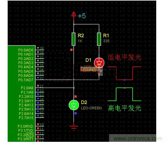 圖1中的D1、D2就可以不經(jīng)其它驅(qū)動器件,直接由單片機的引腳控制發(fā)光顯示。雖然引腳已經(jīng)可以直接驅(qū)動LED發(fā)光,但還是看看AT89C51單片機引腳的輸出能力吧。