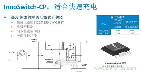 “目前PI提供兩種型號的InnoSwitch-CP器件。INN2214K IC提供15W輸出功率,適用于通用輸入電壓范圍的充電器和適配器應用,而更大型號的INN2215K在同類應用中可提供最大22 W的輸出功率。” Jason介紹說。
