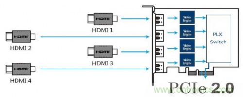 針對圖三中主流的四通道架構(gòu),PLX Switch可以選擇PEX8608,客戶如果有更多通道需求,如八通道,建議選擇PEX8618,但具體要根據(jù)客戶數(shù)據(jù)量來決定,系統(tǒng)架構(gòu)完全一致,對項(xiàng)目來說,只需要更換PCIE Switch就可以滿足不同應(yīng)用需求,軟件方面無需改動,加速上市時(shí)間,搶占市場。