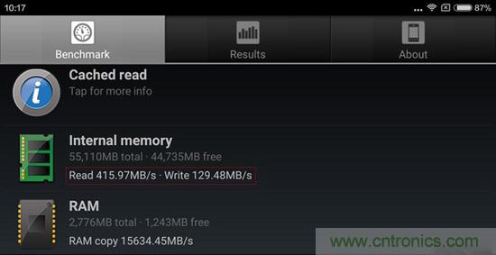聊了這了這么多,UFS 2.0閃存的讀寫速度究竟有多快呢?相信這是不少朋友想要急切了解的。接下來,我們將通過終端產品的實測數據來說話。在專業存儲卡測速工具——“A1 SD Bench”的速度測試中,小米5(高配版)機身存儲(注:UFS 2.0閃存)讀取速度為415.97MB/s,寫入速度則為129.48MB/s。