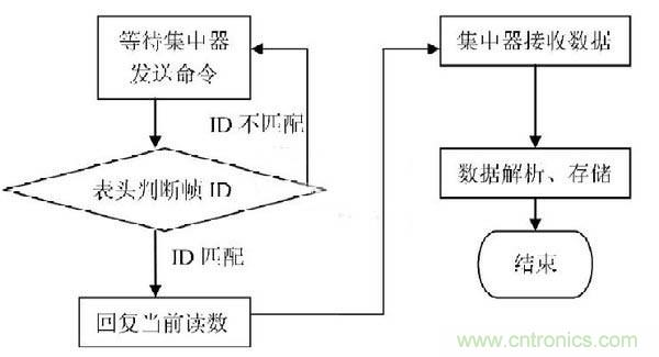 對時成功后,集中器繼續等待上位機的讀數命令或等待中斷讀數命令。當收到讀數的命令后,定時讀數使集中器按設置的時間,自動讀取表頭采集來的數據;讀數使集中器讀取當前表頭的數據。