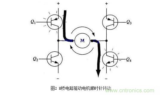 要使電機運轉(zhuǎn),必須使對角線上的一對三極管導(dǎo)通。例如,如圖2所示,當(dāng)Q1管和Q4管導(dǎo)通時,電流就從電源正極經(jīng)Q1從左至右穿過電機,然后再經(jīng)Q4回到電源負(fù)極。按圖中電流箭頭所示,該流向的電流將驅(qū)動電機順時針轉(zhuǎn)動。當(dāng)三極管Q1和Q4導(dǎo)通時,電流將從左至右流過電機,從而驅(qū)動電機按特定方向轉(zhuǎn)動(電機周圍的箭頭指示為順時針方向)。