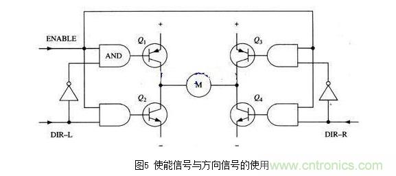 改進電路在基本H橋電路的基礎(chǔ)上增加了4個與門和2個非門。4個與門同一個“使能”導(dǎo)通信號相接,這樣,用這一個信號就能控制整個電路的開關(guān)。而2個非門通過提供一種方向輸人,可以保證任何時候在H橋的同側(cè)腿上都只有一個三極管能導(dǎo)通。(與本節(jié)前面的示意圖一樣,圖4所示也不是一個完整的電路圖,特別是圖中與門和三極管直接連接是不能正常工作的。)