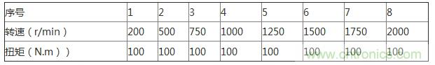 加載電機在轉速控制模式下,從0慢慢提高給定轉速0-200r/min.轉速穩定后,在扭矩模式下,從0慢慢提高給定扭矩1-100Nm,隨后再逐次上升轉速:
