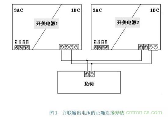 由于在電源設計中,輸出接線端子一般都按單個電源的最大容量來計算和選定的,因此電源并聯運行時,各電源的輸出端電壓不能直接地連接,這樣連接的終端會出現過載現象。PULS電源采用了二個輸出端子,如圖1所示。從電源單元到負載的連接線應使用相同長度和橫截面的導線。同時輸出電壓必須連接在一個公共的接線端上。這樣保證每個電源不會在傳輸導線上產生不同的電壓降,避免輸出回路電流的產生。采用被動式均流技術的并聯運行時各個并聯電源的輸出電壓值必須完全一致,為了達到這個目的,許多可并聯的開關電源輸出電壓是可調的,如PULS電源的輸出為24~28V可調。這樣在所有并聯的電源接上負載以前,各個開關電源的輸出電壓就可調整到一致的電壓值。