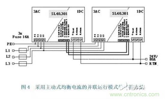主動式均衡電流的并聯模式必須采用一根附加的均流線,這根均流線作為反饋信號傳送到電源的控制器來調節(jié)每個電源在所有的條件下提供相同的輸出電流,這時,電源電壓輸出的軟特征是不需要的,輸出電壓在任何場合下不受電流大小的影響,所以與被動式均衡電流相比,其輸出電壓精度高,同時與輸出電路的類型無關;但是對于開發(fā)和安裝來說,費用較高,因為在電源內部需要一個精確度較高的電流測試線路和一個附加的電流調節(jié)器,同時也多一個接線端口。PULS電源的SL40.301三相24/40A的電源采用這種技術,所有的電源經過均流線和地線相連接,如圖4所示。