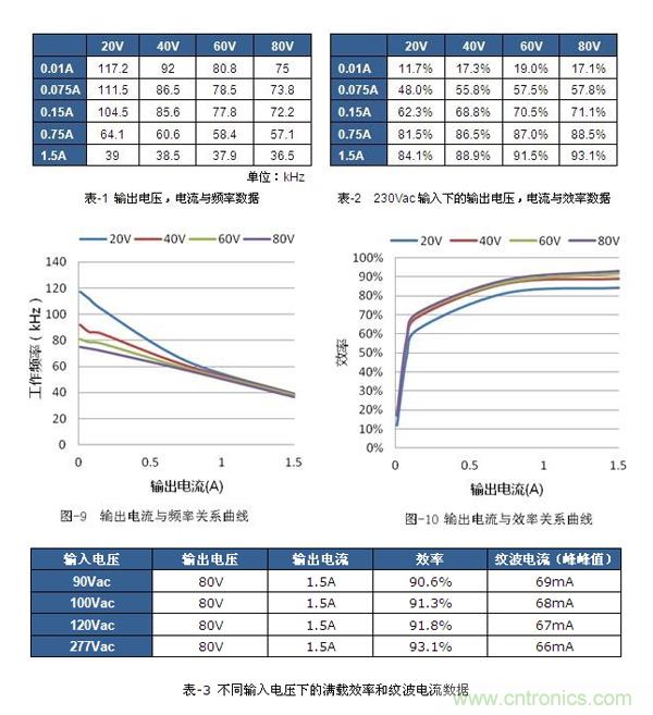 在230Vac的輸入條件,80V、1.5A的條件下得到最高的效率93.1%。詳細(xì)數(shù)據(jù)如表-2和圖-10所示。表-3是全電壓范圍下的滿載效率和紋波電流數(shù)據(jù)。可以看出紋波電流的表現(xiàn)也很優(yōu)秀,峰-峰值小于2.5%,都在70mA以下。