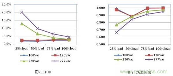 另外,ICL5101的THD和PF性能也很出色,詳細(xì)數(shù)據(jù)分別如圖-11和圖-12所示。100%負(fù)載下,THD可低于5%。甚至在50%負(fù)載及277Vac條件下,THD小于10%,遠(yuǎn)低于EN61000-3-2 class C要求。