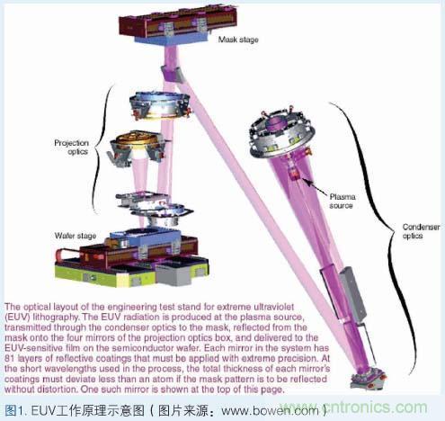 EUV的基本工作原理:激光對準氙氣噴嘴。當激光擊中氙氣時,會使氙氣變熱并產生等離子體;一旦產生等離子體,電子便開始逃逸,從而發出特定波長的光;接著這種光進入聚光器,然后后者將光匯聚并照到掩膜上;通過在反射鏡的一些部分施加而其它部分不施加吸收體,在反射鏡上形成芯片一個平面的圖案的光學表示,這樣就產生了掩膜;掩膜上的圖案被反射到四到六個曲面反射鏡上,從而將圖像微縮,并將圖像聚投到硅晶圓上;每個反射鏡使光線稍微彎曲以形成晶圓上的圖像,這就像照相機中的透鏡將光彎曲以在膠片上形成圖像一樣。