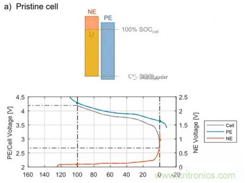 首先Christoph R. Birkl根據(jù)扣式電池極片的面積計(jì)算得到了扣式電池的理論容量,然后通過(guò)對(duì)正極極片進(jìn)行充電脫鋰模擬了不同程度的鋰鋰離子損失,通過(guò)對(duì)負(fù)極極片進(jìn)行裁切模擬了負(fù)極活性物質(zhì)損失,對(duì)正極極片裁切模擬了正極活性物質(zhì)損失。為了對(duì)試驗(yàn)結(jié)果進(jìn)行分析,Christoph R. Birkl利用柱狀圖建立了一個(gè)物理模型,如上圖所示,其中左側(cè)為負(fù)極的SoC狀態(tài),右側(cè)為正極的SoC狀態(tài),上圖模型為正常電池的模型,從圖上可以看到在正常電池設(shè)計(jì)中,一般會(huì)負(fù)極的容量設(shè)計(jì)的稍微高一些,這一般稱作正負(fù)極冗余,適當(dāng)?shù)娜哂嗫梢员WC鋰離子電池循環(huán)性能,也能在鋰離子電池發(fā)生過(guò)充的情況下能夠容納足夠的鋰,確保鋰不析出,保證電池的安全性。