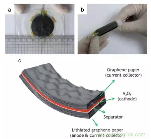 3.柔性石墨烯有望制造柔性儲能裝置。使用石墨烯及其組件可以制備出具有高度柔韌性的集流體,為我們提供了一種取代脆性金屬集流體的方法。此外,利用石墨烯還能制備出集成柔性電極,有助于解決在反復彎曲過程中集流體活性材料分離的問題。