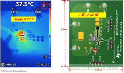 TPS61230A基于谷值限流模式控制方案,最小開關電流為4.8A。該器件集成了兩個低RDS(on)FET(18mΩ/高速,21mΩ/低速),這使其具有更高的效率和更良好的熱性能。在室溫條件下,VIN = 3.6V,VOUT = 5.0V,IOUT = 2.0A時,只能實現25℃的升溫,如圖3所示。