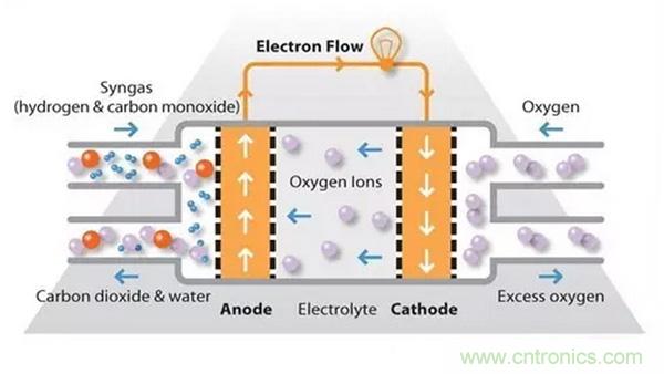 SOFC使用固體陶瓷電解質,例如用氧化釔穩(wěn)定的氧化鋯,而不是液體或膜。它們的高工作溫度意味著燃料可以在燃料電池本身內重整,消除了對外部重整的需要,并允許單元與各種烴燃料一起使用。與其它類型的燃料電池相比,它們還相對耐燃料中的少量硫,因此可以與煤氣一起使用。