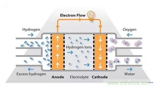 氫燃料在陽極處被處理,其中電子與鉑基催化劑的表面上的質子分離。質子通過膜到達電池的陰極側,同時電子在外部電路中行進,產生電池的電輸出。在陰極側,另一個貴金屬電極將質子和電子與氧氣結合以產生水,其作為唯一的廢物排出;氧可以以純化形式提供,或者在電極處直接從空氣中提取。