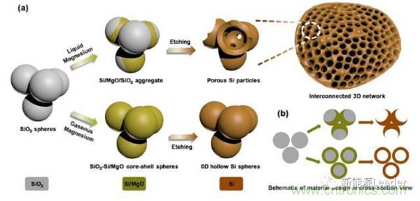 晶體Si的優勢是容量高,首效高,缺點是體積膨脹大,為了克服這一問題,工業上一般是將晶體Si制成納米顆粒,分散在石墨之中,利用石墨吸收Si的體積膨脹。也可以將Si材料制成特殊形狀,例如Si納米線,蜂巢狀Si等。浙江大學的Hao Wu等「4」利用鎂熱反應制成了蜂窩狀的硅材料,如下圖所示,獨特的蜂窩狀結構能夠很好的吸收Si的體積膨脹,顯著改善了循環性能,循環800次容量仍然可達1058mAh/g,容量保持率為91%。