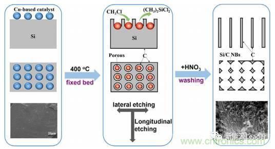 將Si材料與石墨復合也是克服Si體積膨脹的重要途徑,也是目前唯一上也化運用的方法。來自中科院過程所的Wenfeng Ren等[5]提出了一中新型的Si-C樹枝狀復合結構,如下圖所示。該方法首先在工業級多晶硅的表面分散一層銅基催化劑,然后在CH3Cl氣氛下,利用該催化劑對Si基體進行腐蝕,最終獲得樹枝狀的Si材料,這些Si晶體之間的空隙能夠很好的吸收體積膨脹,同時CH3Cl分解后會在Si表面形成一層無定形碳對Si形成保護,該材料在50mA/g的電流密度下,比容量可以達到849mAh/g,并具有良好的循環性能。