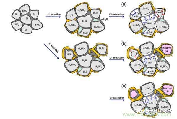 同樣來自韓國的Insoo Choi等[7]還對SiOX失效機理進行了分析,實驗中Insoo Choi發現,Si/SiOX/C復合電極的失效模式分為兩類,一類是局部實效,一類是全面實效。局部失效主要是在充放電過程中Si/SiOX反復膨脹,SEI膜變厚,導致活性物質顆粒與導電網絡失去連接,部分嵌鋰的Si顆粒不再參與到充放電反應之中,導致電池容量的衰降。全局失效模式主要是因為粘結劑失效等原因,導致負極粉化掉料,引起活性物質損失。