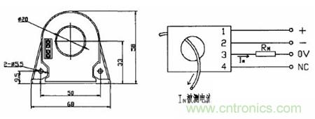本系統選用的是宇森CBH100SF 型號的閉環霍爾電流傳感器。測量頻率是0-100KHz,額定電流100A,測量范圍:0-±150A,匝數比1:1000,精度0.2%-1%,相應時間:《lus。結構如圖3-3 所示: