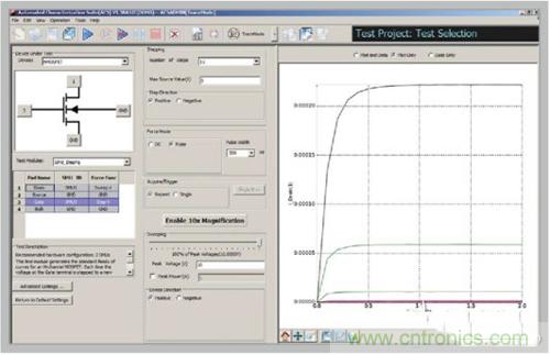 對這類應用,非常重要的一點是要有一整套測試功能,包括脈沖、DC和C-V。采用器件專用詞匯的軟件(而不是儀器專用詞匯)可以幫助簡化測量。這些軟件還可以簡化多臺源測量單元(SMU)儀器之間的交互,用戶可以把重點放在被測器件上,而不是測量儀器上。