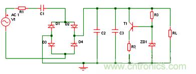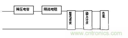 D1作半波整流用,C2、C3為濾波電容,交流電源U上半周時,經(jīng)C1、R1降壓,由D1整流后給電容C2平滑濾波輸出