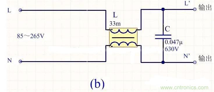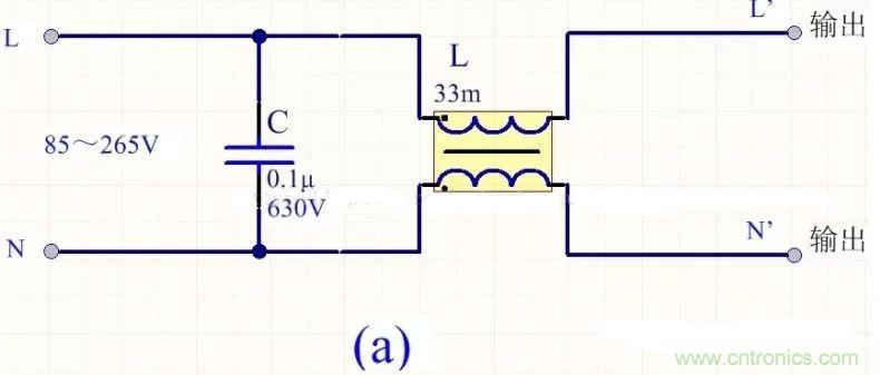 為降低成本和減小體積,開關(guān)電源一般采用簡易的EMI濾波器,主要包括共模扼流圈L和濾波電容,以下四種可以根據(jù)情況進行選擇: