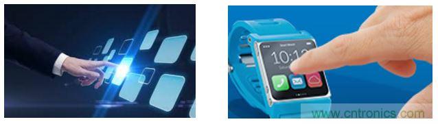 電容式觸摸顯示屏 ─觸摸顯示屏為中型及大型的物聯(lián)網(wǎng)設(shè)備提供豐富的用戶界面。從微波爐到手持式醫(yī)療設(shè)備,從智能手表到工業(yè)控制器等等。通常,使用電容觸摸技術(shù)結(jié)合顯示屏上透明的銦錫氧化物層(ITO)來實(shí)現(xiàn)觸摸顯示屏。依據(jù)這種應(yīng)用方式,電容式觸控技術(shù)要求能夠在潮濕的環(huán)境下工作。
