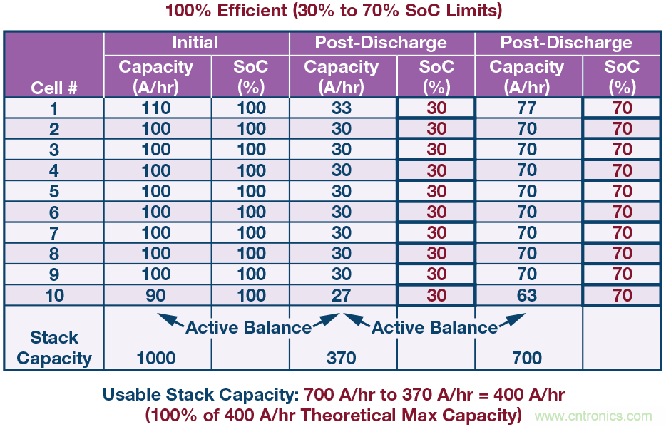 圖3顯示了使用理想主動均衡功能可以100%恢復因電池單元間不匹配而導致的容量損失。在穩態使用期間,當電池包從70% SoC 的完全充電狀態放電時,必須從第1個單元(最高容量電池單元)中取出存儲的電荷并轉移到第10個單元(最低容量電池單元),否則第10個單元會先于其他單元達到最小30%的SoC點,導致電池包必須停止放電以防壽命進一步縮短。類似地,在充電階段必須將電荷從第10個單元中移除,重新分配到第1個單元,否則第10個單元會率先達到70%的SoC上限,導致充電周期必須停止。在電池包使用壽命中的某個時間點,電池單元老化的差異將不可避免地造成電池單元之間的容量不匹配。只有主動均衡解決方案才能恢復容量,根據需要將電荷從高SoC單元重新分配給低SoC單元。為在電池包使用壽命期間實現最大容量,需要通過主動均衡解決方案來給單個電池單元有效充電和放電,以使整個電池包維持SoC均衡。
