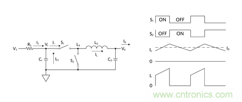 圖 5:Buck 調節器原理簡圖及其工作波形傳導 EMI。