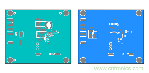 現在,我們以 Maxim 的喜馬拉雅 MAX17502 寬輸入范圍 IC 為例,器件工作在 4.5-60Vin、0.9- 54Vout,提供 1A 負載電流。以下為 MAX17502 EMI 評估板 PCB 的布局,采用了法拉第屏蔽技術 (b)。圖 11a 所示為頂層和底層,用作法拉第屏蔽;圖 11b 所示為內部第二層和第三層,用于布線。這里的第二層用作額外屏蔽,也可用于布線。該布局中,高 di/dt 電流環路 I1 和 I2 布置在第三層, 被完整籠罩在法拉第屏蔽中。