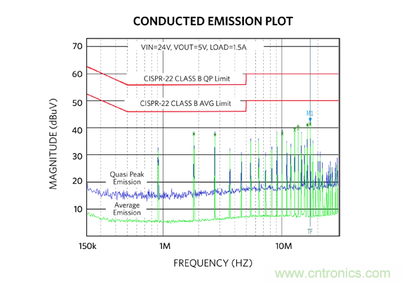以下為 MAX17502 EMI 評估板的 EMI 測試結果,以非常好的裕量通過了 CISPR 22 標準 B 類要求。
