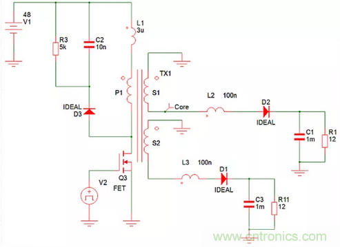 例如,一個(gè)反激式電源可分別從一個(gè)48V輸入產(chǎn)生兩個(gè)1 A的12V輸出,如圖1的簡(jiǎn)化仿真模型所示。理想的二極管模型具有零正向壓降,電阻可忽略不計(jì)。變壓器繞組電阻可忽略不計(jì),只有與變壓器引線串聯(lián)的寄生電感才能建模。這些電感是變壓器內(nèi)的漏電感,以及印刷電路板(PCB)印制線和二極管內(nèi)的寄生電感。當(dāng)設(shè)置這些電感時(shí),兩個(gè)輸出相互跟蹤,因?yàn)楫?dāng)二極管在開關(guān)周期的1-D部分導(dǎo)通時(shí),變壓器的全耦合會(huì)促使兩個(gè)輸出相等。