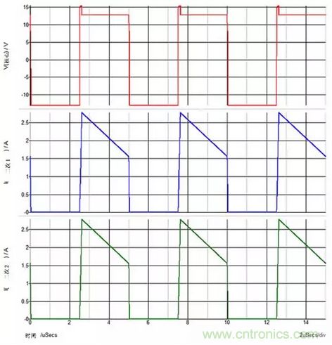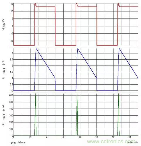 圖2:當(dāng)對(duì)兩個(gè)輸出施加重載時(shí),在整個(gè)1-D周期內(nèi),次級(jí)繞組電流在兩個(gè)次級(jí)繞組中流動(dòng)。您可以看到上方紅色跡線上的基座電壓。